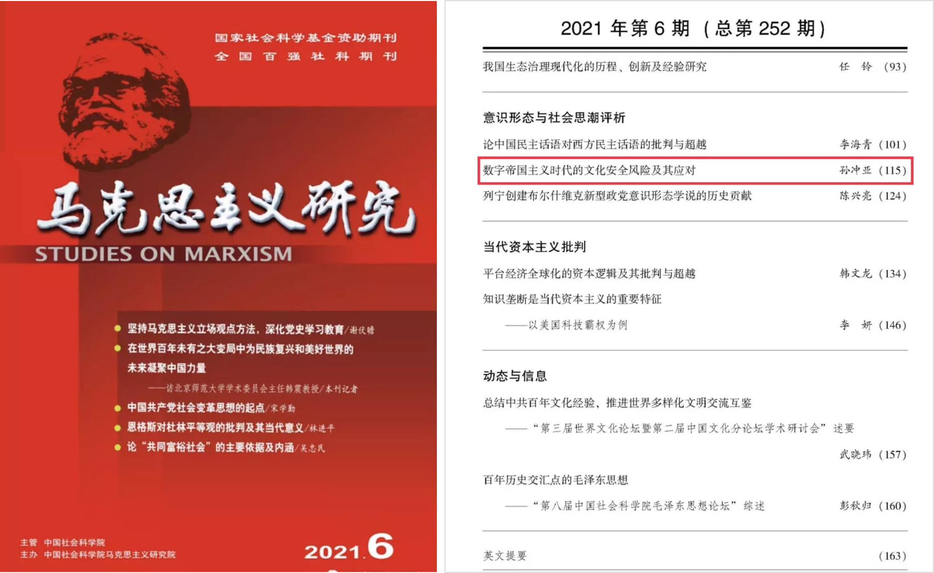 马院2019级博士研究生孙冲亚的学术论文《数字帝国主义时代的文化安全风险及其应对》,独立发表在权威刊物《马克思主义研究》2021年第6期。此前,我院在读博士生独立或以第一作者在《马克思主义研究》上至少发表三篇论文,近年几乎每年一篇,在全国马院中名列前茅。
