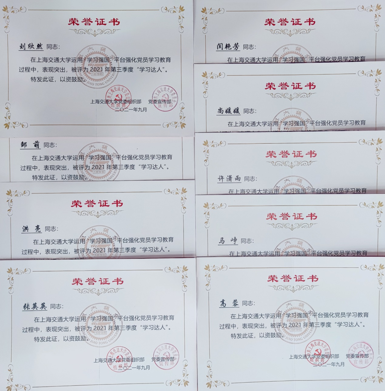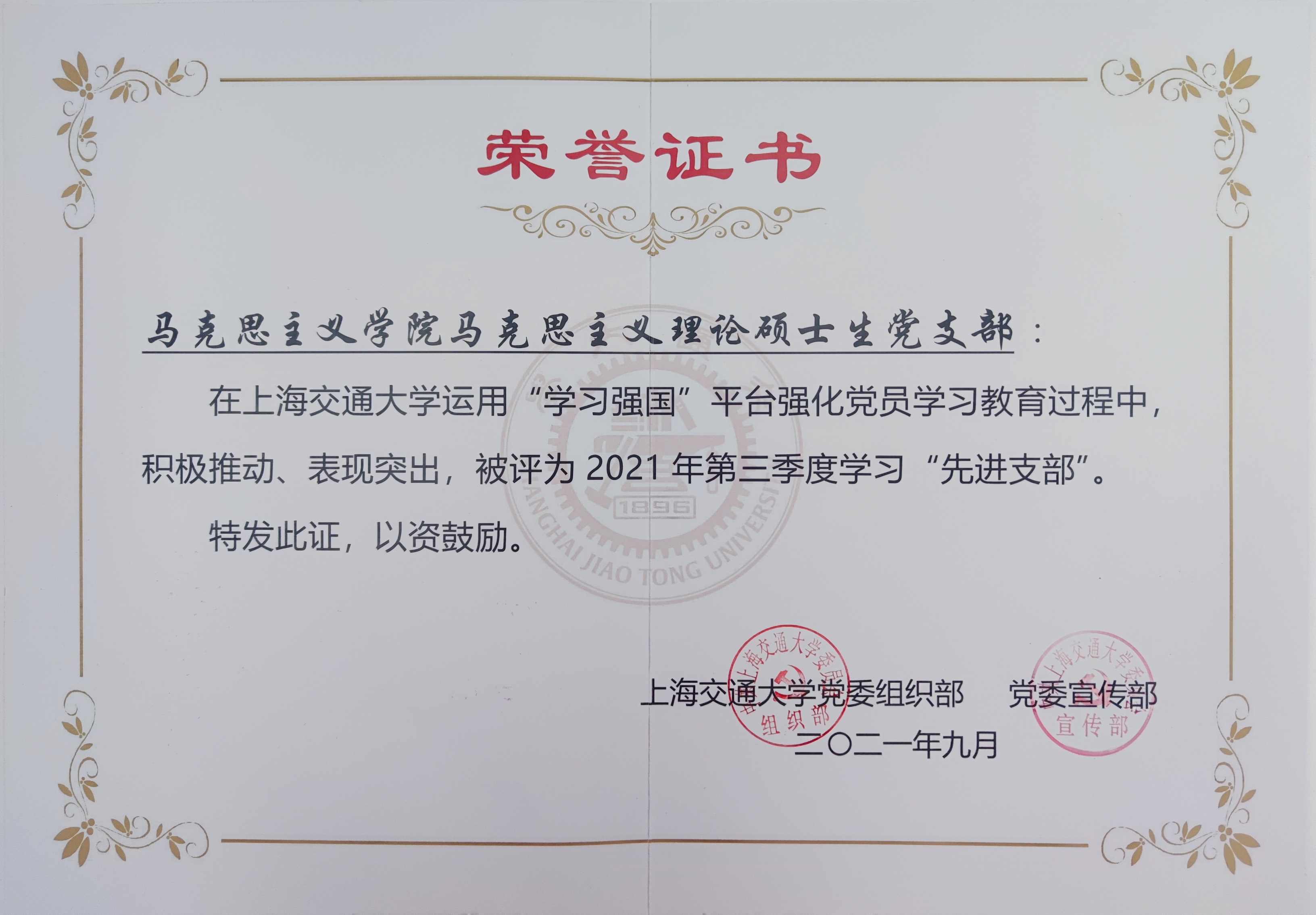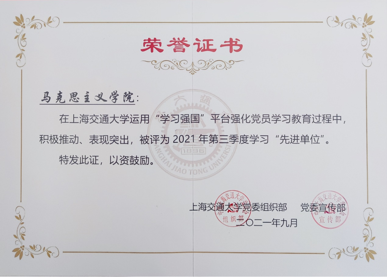 根据校党委宣传部“学习强国”第三季度积分评比结果,77779193永利官网在本季度“学习强国”积分评比中,喜获两个集体奖、9个个人奖:学院党委获得“先进单位”,马克思主义理论硕士生党支部获得“先进支部”;刘欣然、邹萌、洪亮、张英英、闫艳芳、尚媛媛、许潇雨、马峥、高蓉等9名师生获得“学习达人”。