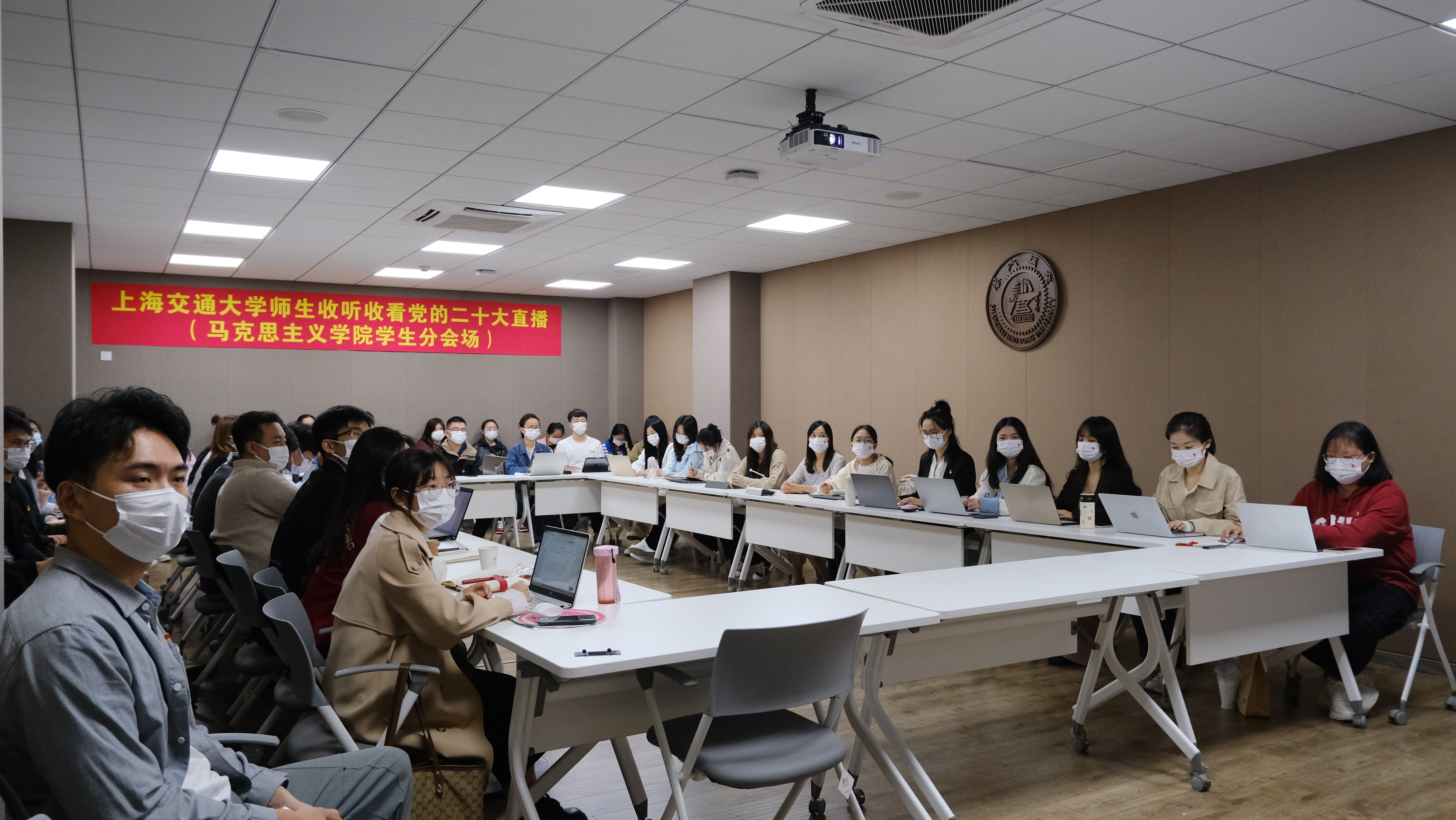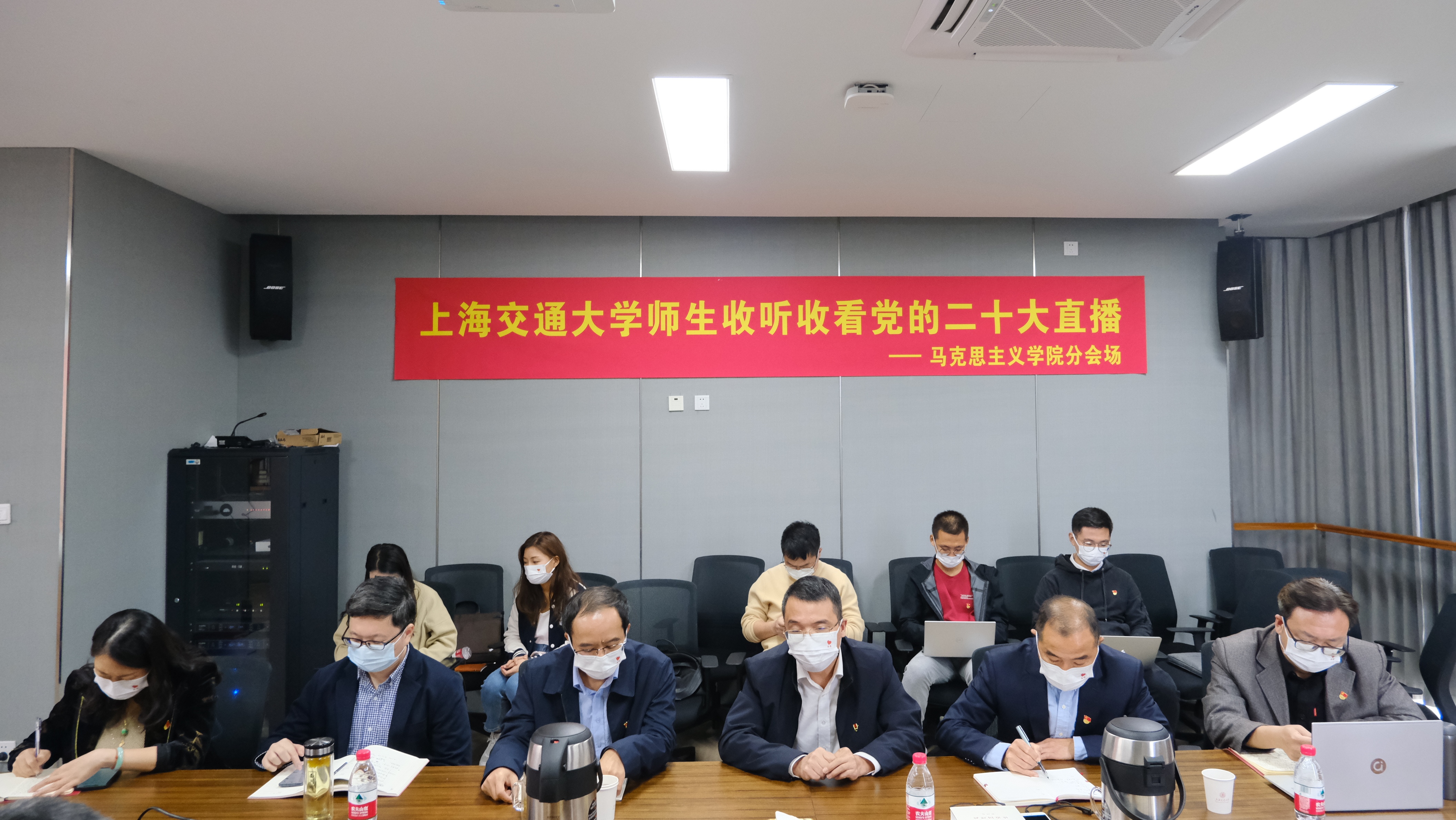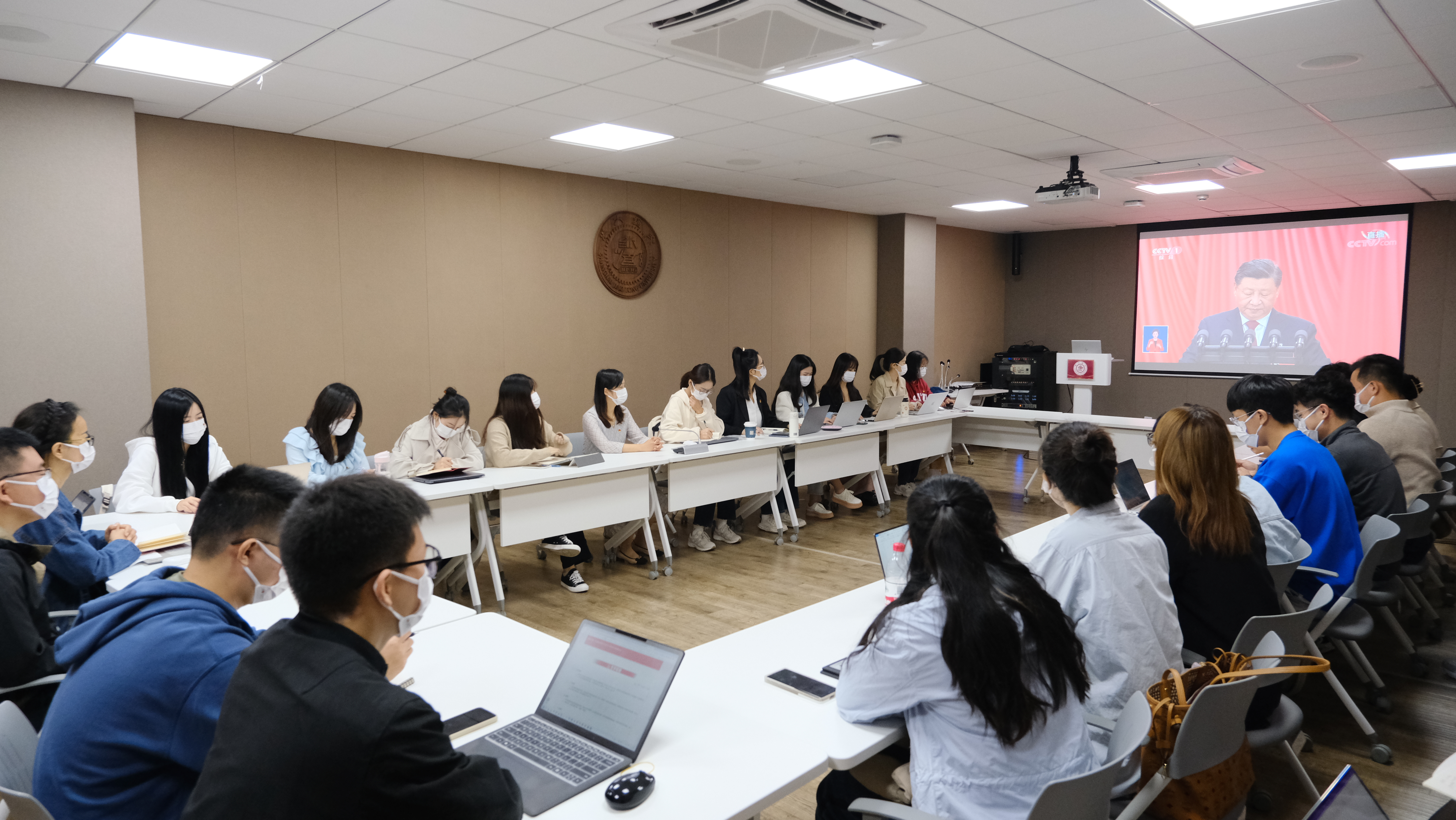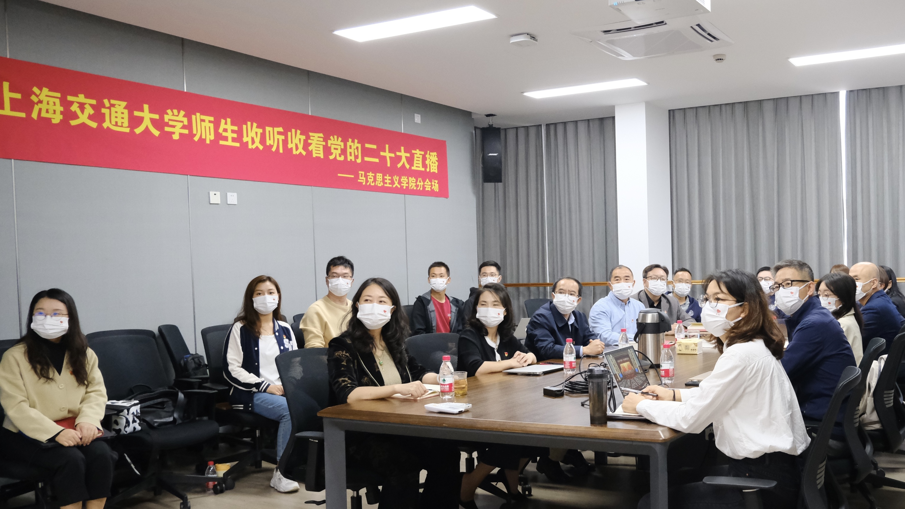 10月16日上午,中国共产党第二十次全国代表大会在北京隆重开幕。在这一重要历史时刻,77779193永利官网党委发动全院师生通过各种方式收听收看党的二十大开幕实况直播,实时聆听习近平总书记作报告。学院党委精心组织党政班子成员、党支部书记、教研室主任、党员代表、入党积极分子代表、教学科研骨干以及学生代表等二十余人,在学院会议室线下集体收看现场直播,会后立即展开热烈议论,纷纷表达适逢盛会的喜悦兴奋之情。