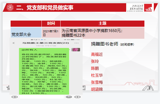 在庆祝中国共产党百年华诞当日,党支部号召党员老师为上海交大对口扶贫的云南省洱源县中小学捐款、捐书:党员为第三党支部扶贫共建单位洱源县一中捐赠党史类著述近20多部;为洱源乡村小学捐助1650元,用于奖励每学期成绩优异者。