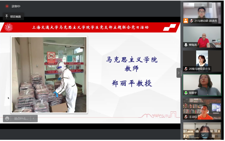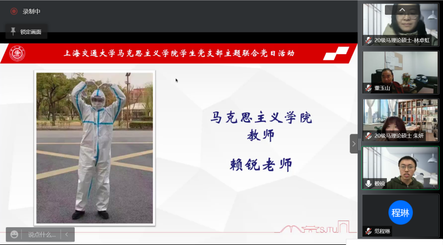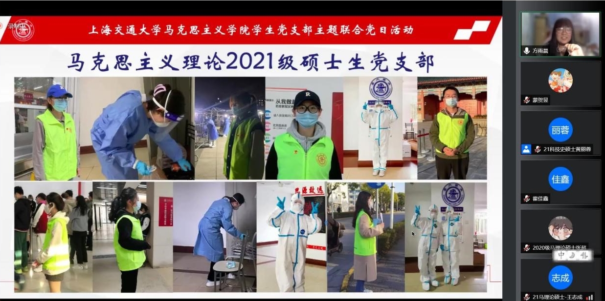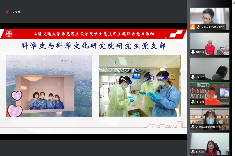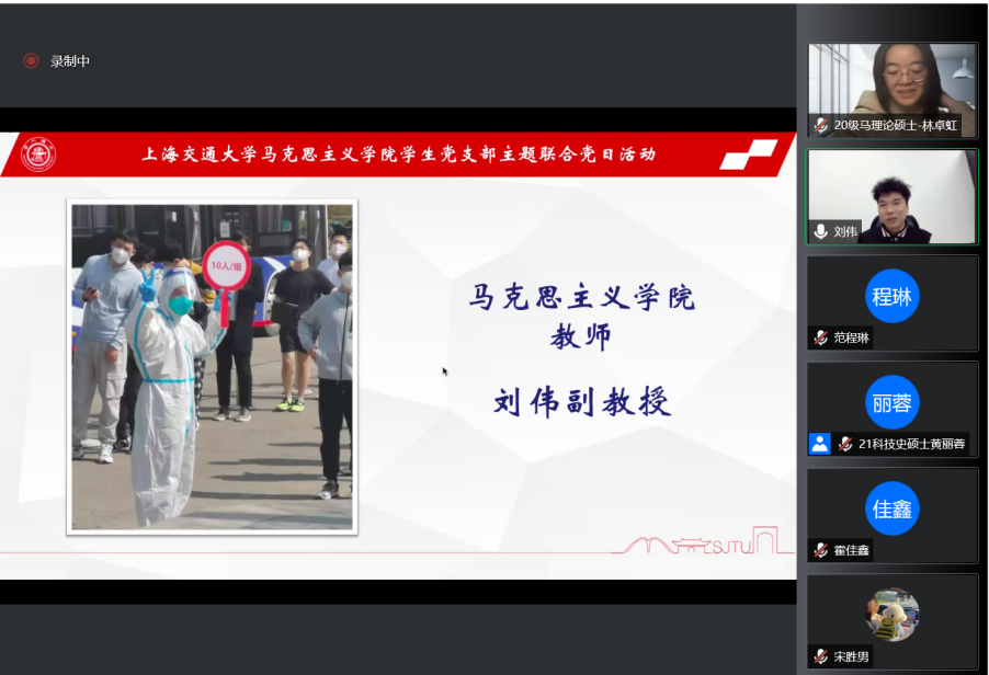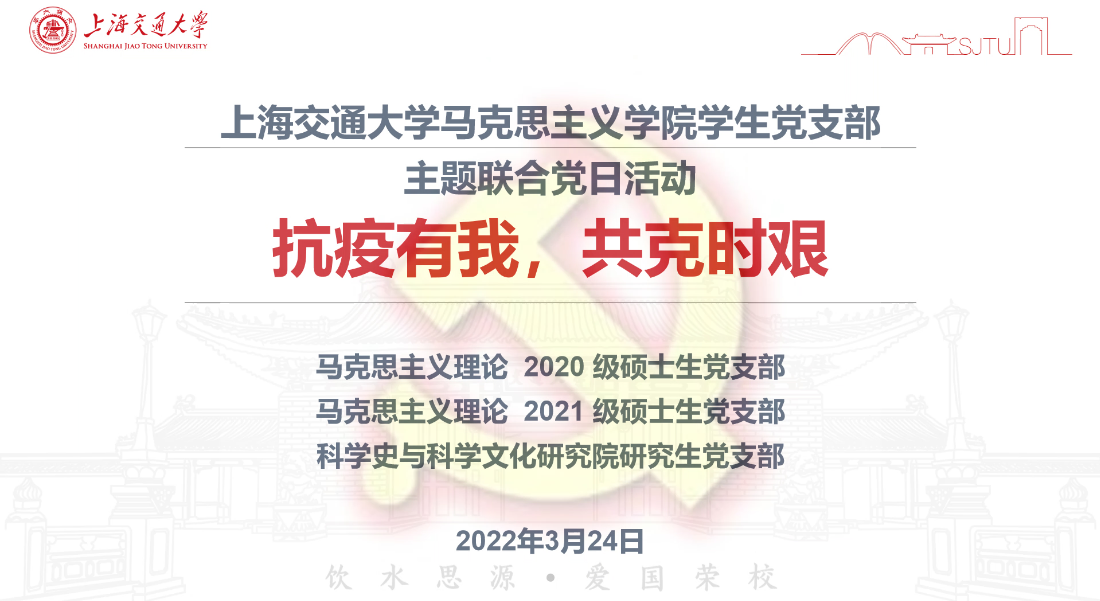 2022年3月24日晚,为响应国家、上海市新冠肺炎疫情防控要求,77779193永利官网学生党支部开展“抗疫有我,共克时艰”主题线上联合党日活动。77779193永利官网党委书记董玉山、党委副书记任祝景、教师代表柳海涛教授、郑丽平教授、刘伟副教授、赖锐老师、学工办全体老师、马克思主义理论2020硕士生党支部、马克思主义理论2021级硕士生党支部以及科学史与科学文化研究院研究生党支部全体党员参会。会议由马克思主义理论2020级硕士生党支部书记程惠芬主持。