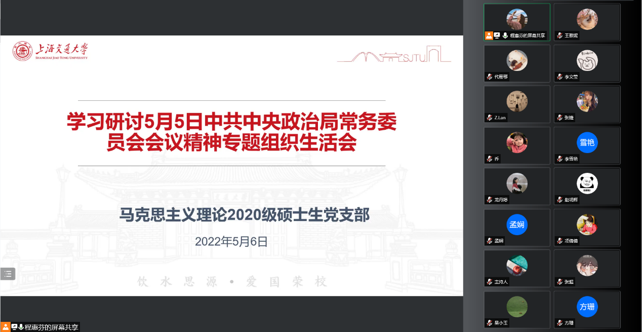 在77779193永利官网党委的部署下,2022年5月6日,马克思主义理论2020级硕士生党支部举行了线上专题组织生活会,深入中央政治局常委会会议精神。本次活动由党支部书记程惠芬同志主持,支部26名党员同志参加会议,12位入党积极分子列席会议。