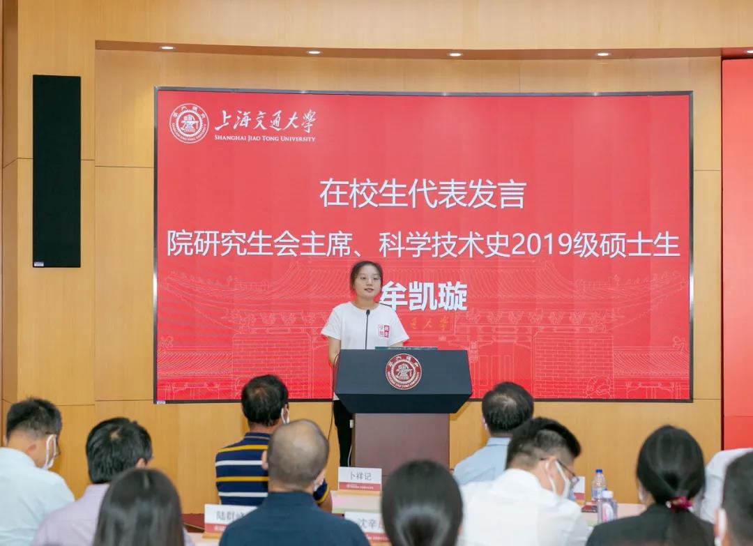学院研究生会主席、2019级科学技术史专业硕士生牟凯璇作为在校生代表发言,鼓励大家在今后的学习生活中,坚定理想信念,迎难而上,运用专业所长,谱写属于交大马院人的崭新篇章。